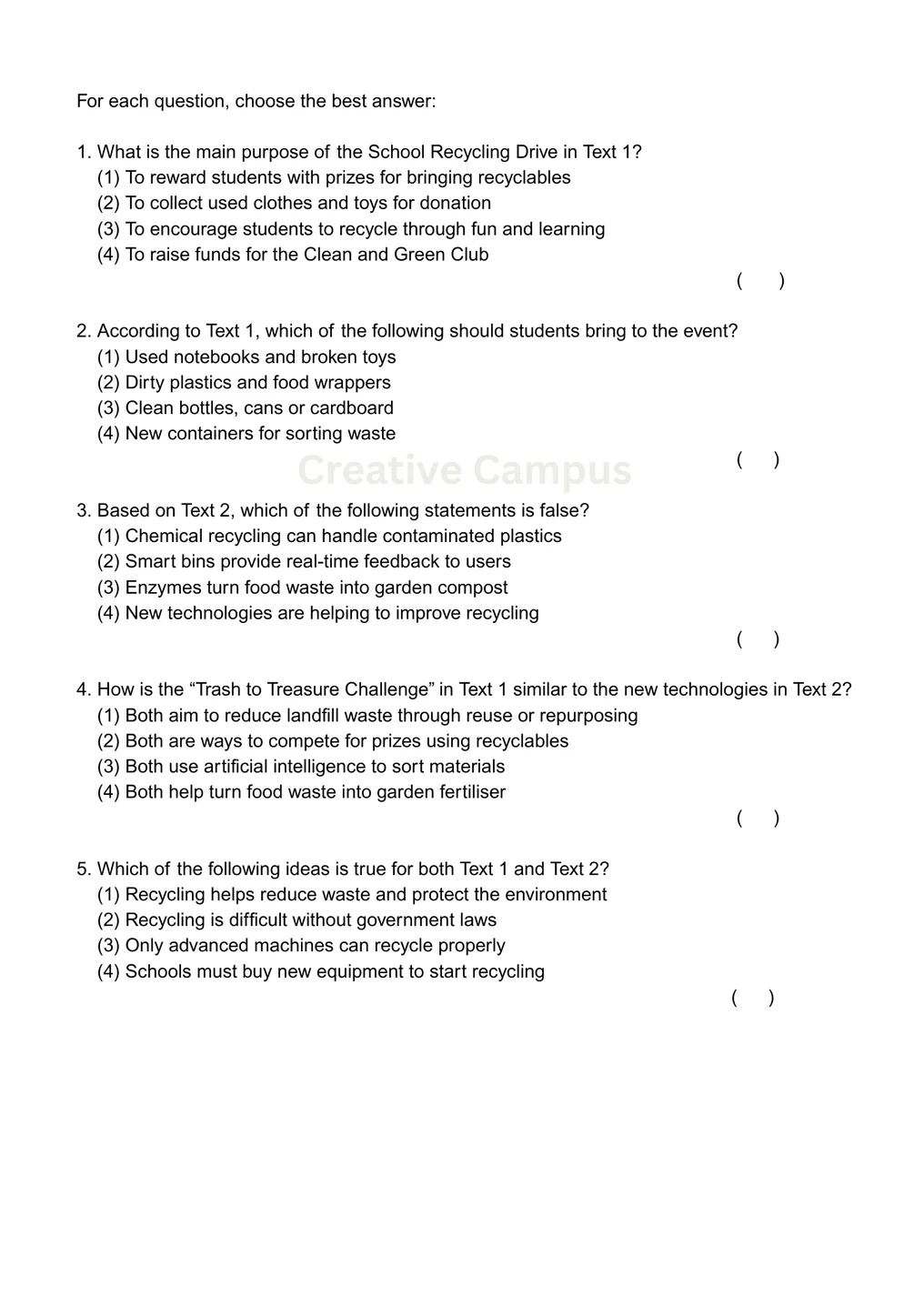 Questions may be based on either text or require comparison between both texts. Since all questions are multiple choice, there are no partial marks; each correct answer earns 1 full mark.