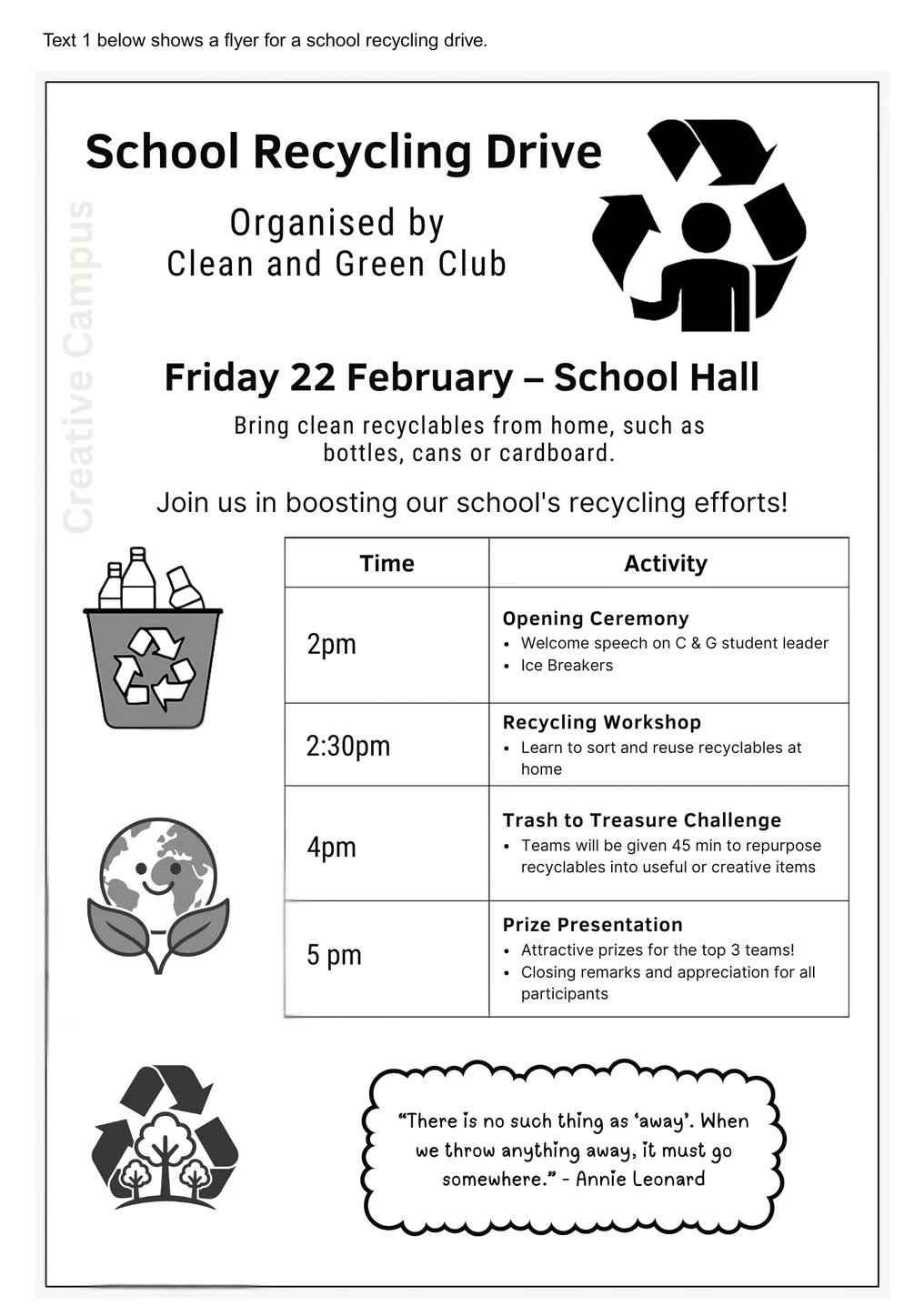 - Text 1 – A visual text such as a poster, advertisement, or infographic that combines images and words.